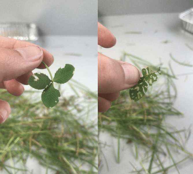 • Nicole and Tash are well into the botanical composition analysis of all paddocks on the farmlet. An observation from this morning was the presence of clover root weevil and clover flea damage on the clover leaves.
