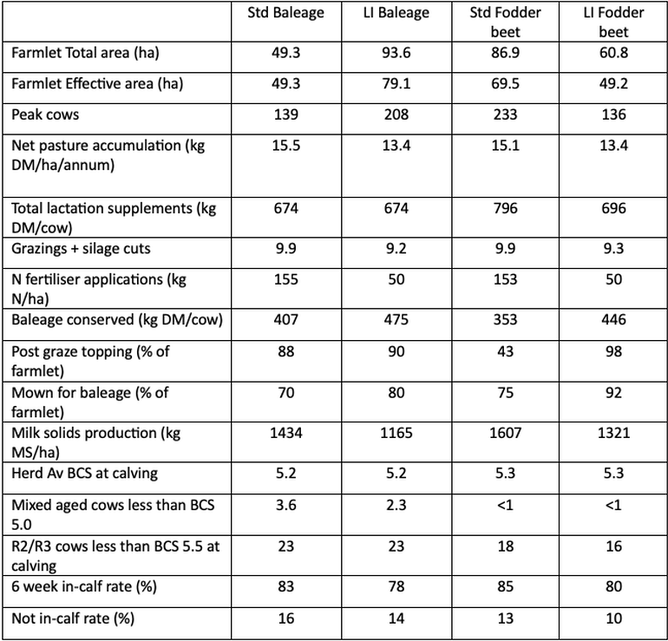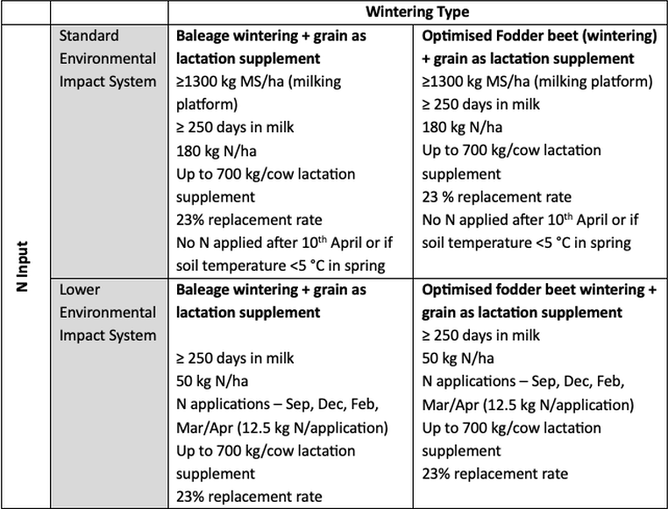 The initial design used an unbalanced 2x2 factorial, with system intensity (standard (Std) vs lower impact (LI)) and wintering type (fodder beet vs silage/baleage) comprising the two factors. The design was unbalanced due to the needs of the standard system, in which it was proposed that cows would be wintered on pasture silage in the off-paddock infrastructure while the LI system cows would be wintered on baleage (LI Baleage) in pasture paddocks within the milking platform area.