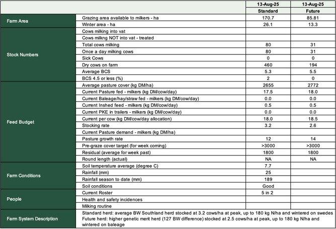 We (like a lot o Southland) are experiencing higher than normal APC for this time of the season. While we are only in the early days of spring we are constantly considering ways to best manage this using a spring rotation planner to ensure high pasture quality in the second round and beyond. We are currently using the later calving cows to achieve post grazing targets given the great ground conditions we have. The spring rotation planner with a slow to start calving and high average pasture covers is currently tracking above balance date target for both farmlets (4th October for Standard herd and 24th September for the Future herd).