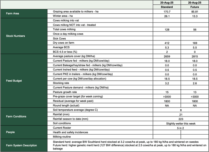 Higher genetic merit herd (127 BW difference) stocked at 2.5 cows/ha at peak, up to 180 kg N/ha and wintered on baleage.