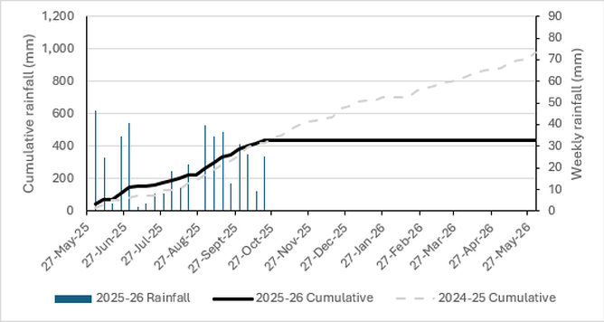 Rainfall is higher than the same time last year by 18.8mm due to this week’s rain – hard to believe given how wet it was in September and October last year. The strong winds have helped dry out some of our wetter paddocks. Like many in the lower South, we’re keen to get started on winter crop cultivation.