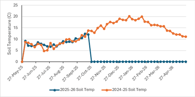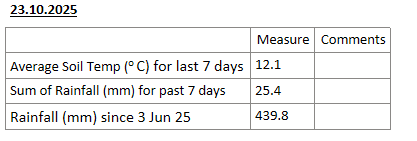 This week, soil temperatures dropped only slightly from 12.3°C to 12.1°C, which surprised us given the grass growth was a little better than expected. Interestingly, at this time last year, soil temperatures were 13.8°C. Contractors are no doubt itching for things to dry out. A couple of paddocks have been closed for conservation and are certainly getting long.