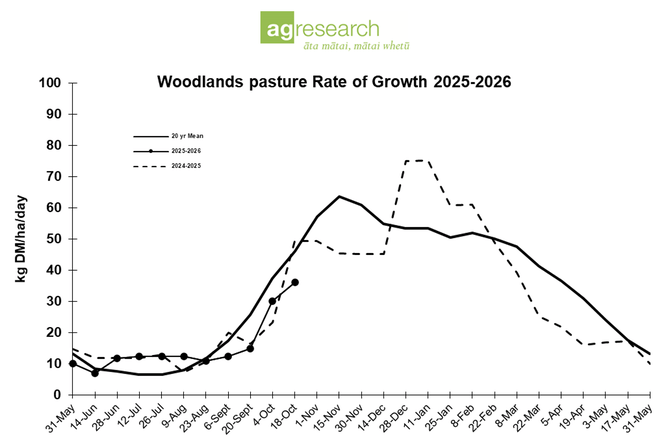 - Pasture growth this week has been slow again (45kg DM/ha/day for Futures and 39kg DM/ha/day for the Standard farmlet). This aligns with Woodlands growth of 36kg DM/ha/day for the week of 18 October. The Woodlands 20-year mean growth is 57kg DM/ha/day, so the region remains well below average for the last few weeks. Warmer temperatures forecast for next week should help turn this around quickly. For those keen to see the full set of pasture growth data, please contact AgResearch scientist Chris Smith at chris.smith@agresearch.co.nz to be added to the distribution list.