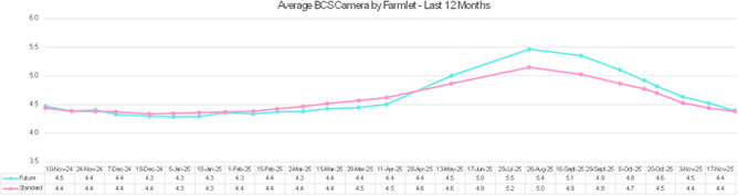 Body condition score (BCS): We're seeing the BCS of both the Standard and Future herds starting to align, with both averaging 4.4. We continue to use our DelPro system to priority-feed lower-condition cows based on information from the BCS camera. Grass quality for the Future cows will be critical to maintaining BCS over the coming months. The condition the Future cows put on through winter has certainly kept them on track heading into mating.
