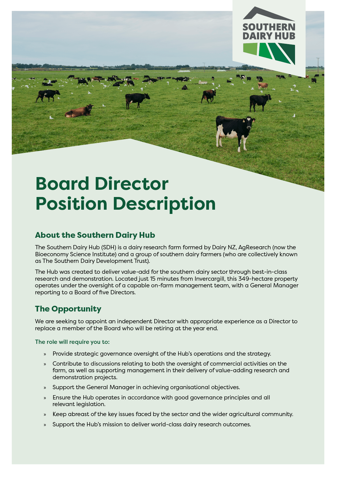 The Southern Dairy Hub is seeking an independent Board Director with proven governance experience and a strong connection to the dairy sector. This is an opportunity to support high quality research, guide strategic direction and contribute to the future of southern dairy farming.